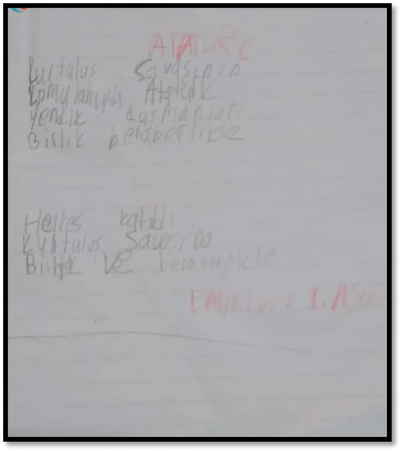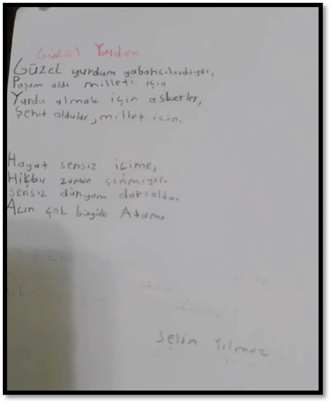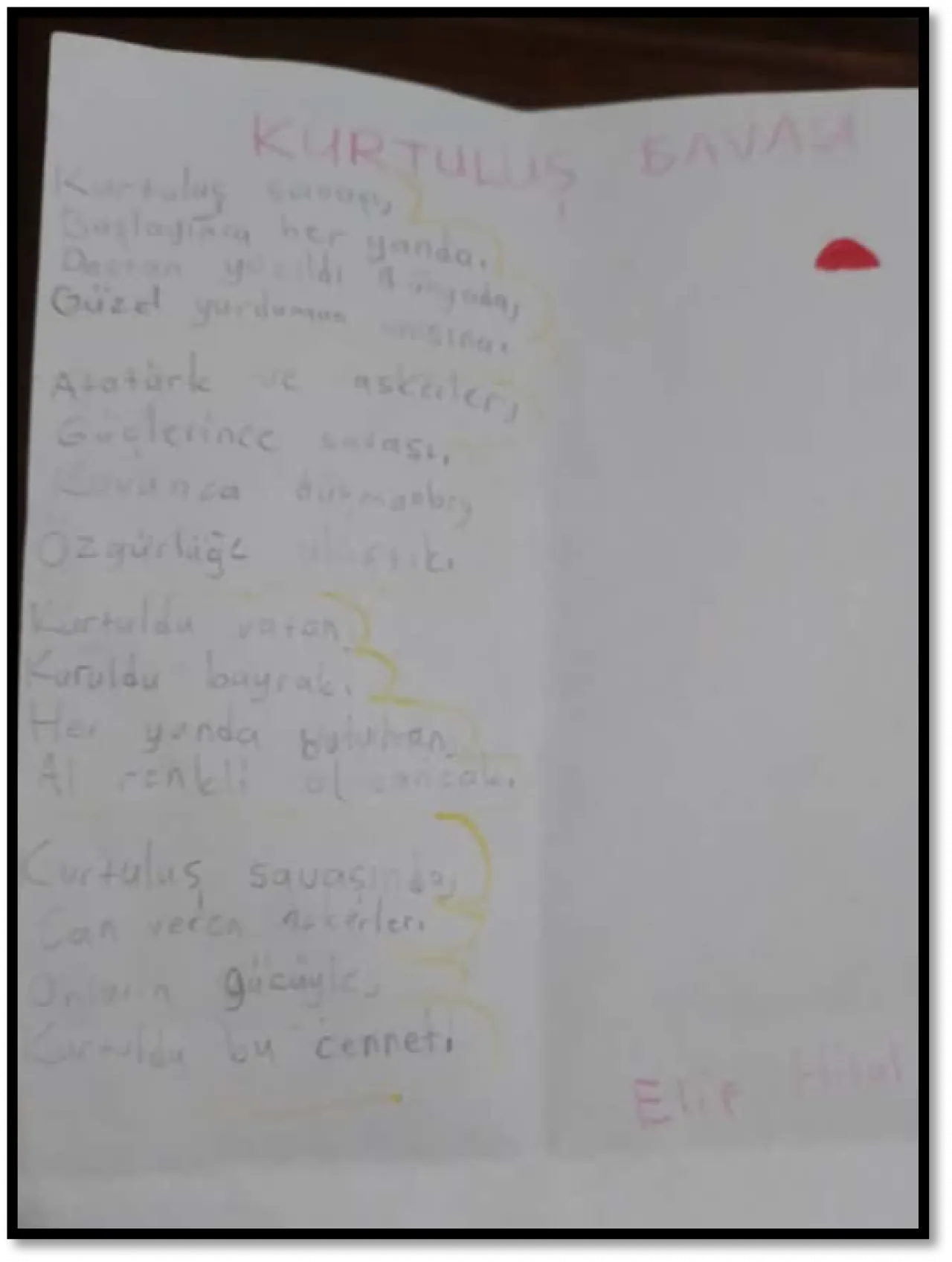 İlimiz Merkez İsmet Paşa İlkokulu 3/B sınıf öğretmeni Aynur AKGÜN, Türkçe öğretim programı kazanımları ekseninde fırsat eğitimi bağlamında “Bu Ulusla Neler Yapılmaz” etkinlikler başlığı altında “Şiir yazıyoruz” etkinlikleri dahilinde öğrencileri ile dersler ve öğretim programlarındaki sarmallık ilkesi dahilinde; “Cumhuriyet Bayramı”–“10 Kasım Atatürk'ü Anma” etkinlikleri kapsamında Milli Değerlerimizi yaşarken, “Değerlerimizi Şiirle İfade Ediyoruz” başlığı altında sınıfça, “ŞİİR” yazma etkinliği düzenlediler.
