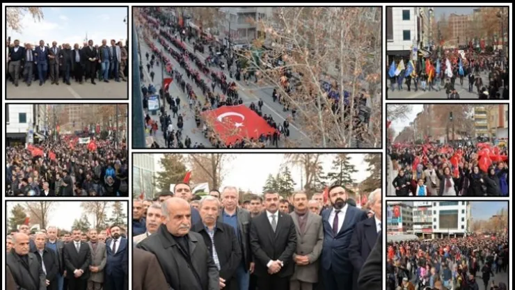MHP İl binası önünden başlayan “Milli Birlik, Beraberlik ve Mehmetçiğe Destek” yürüyüşüne katılan binlerce Malatyalı, teröre öfke, Mehmetçiğe destek sloganları attı. Yürüyüşe Battalgazi Kaymakamı Abdül Kadir Duran, Yeşilyurt Kaymakamı Ali Sakar, Büyükşehir Belediye Başkan Vekili Şefik Şengül, Büyükşehir Genel Sekreteri Ercan Turan, MHP Malatya İl Başkanı Ramazan Bülent Avşar, Esnaf ve Sanatkarlar Odası Başkanı Şevket Keskin, MHP Battalgazi İlçe Başkanı Mesut Samanlı, Malatya Ülkü Ocakları Başkanı Emrah Yılan, Ticaret ve Sanayi Odası Başkanı Hasan Hüseyin Erkoç, Minibüsçüler ve Servisçiler Odası Başkanı Mesut İnce, MTSO Başkan adayı iş adamı Oğuzhan Ata Sadıkoğlu, STK temsilcileri, gaziler ve şehit aileleri katıldı. Kışla Caddesi’nden başlayan yürüyüş, Malatya Park Alışveriş ve Yaşam Merkezi önüne kadar sürdü.Yürüyüşe 30 bin vatandaş katıldı.