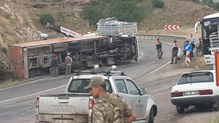 Ağın istikametinde Keban ilçe girişinde köprüye yaklaşık 150 m. Tır virajı alamayıp devrildi .Devrilen tırda maddi hasar meydana geldi ve yaralananlar oldu.