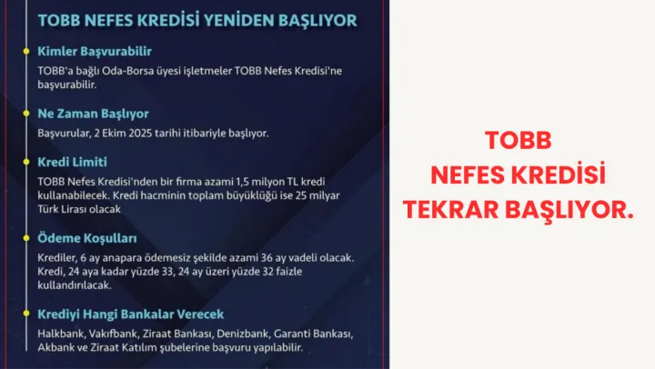 'Odamıza kayıtlı KOBİ üyelerimiz 2 Ekim 2025 tarihinden itibaren kredi başvurusu yapabilecekler. Nefes Kredisi kapsamında bir firmanın azami 1,5 milyon TL'ye kadar kredi kullanabileceğini, kredi hacminin toplam büyüklüğü ise 25 milyar TL olacak.