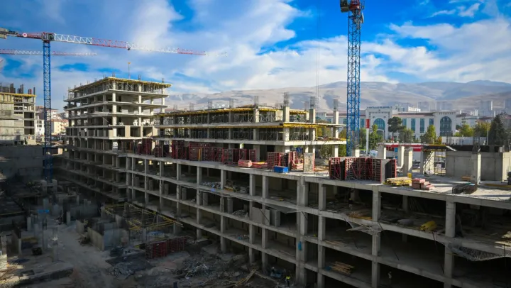 Kahramanmaraş merkezli 6 Şubat depremlerinde büyük yıkım yaşayan Malatya'nın yeniden imar ve inşa faaliyetleri kapsamında eski hal binasının bulunduğu alanda prestij proje olarak yapılan otel, ofis ve ticari ünitelerin inşaatları yükseliyor.