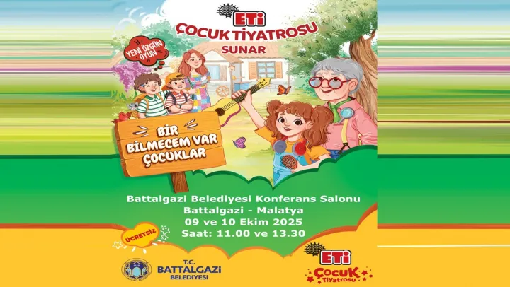 'Eti Çocuk Tiyatrosu' tarafından 'Bir Bilmecem Var Çocuklar' isimli oyun sahnelenecek. Battalgazi Belediyesi Konferans Salonunda sergilenecek oyun tüm çocuklara ücretsiz olacak.