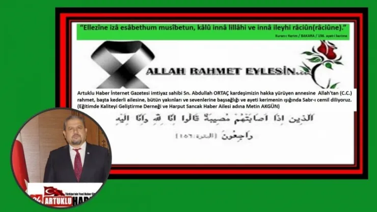 Artuklu Haber İnternet Gazetesi imtiyaz sahibi Sn. Abdullah ORTAÇ kardeşimizin hakka yürüyen annesine Allah'tan (C.C.) rahmet, başta kederli ailesine, bütün yakınları ve sevenlerine başsağlığı ve ayeti kerimenin ışığında Sabr-ı cemil diliyoruz.