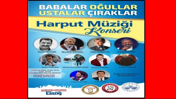 Elazığ Belediyesi, Türk Musikisi Federasyonu ve Elazığ Kültür ve Musiki Derneği tarafından “Babalar Oğullar Ustalar Çıraklar Harput Müziği Konseri” düzenlenecek.