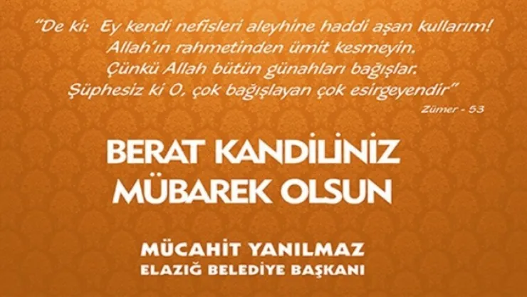 Elazığ Belediye Başkanı Mücahit Yanılmaz, Ramazan ayının müjdeleyicisi Berat Kandili münasebetiyle bir mesaj yayımladı