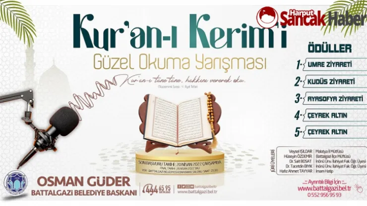 Kur'an-ı Kerim okumaya teşvik etmek, özendirmek ve Kur'an-ı Kerim'in emirlerini anlatmak amacıyla Battalgazi Belediyesi tarafından ödülü Umre, Kudüs ve Ayasofya ziyareti olan 'Kur'an-ı Kerimi Güzel Okuma' Yarışması düzenlenecek.
