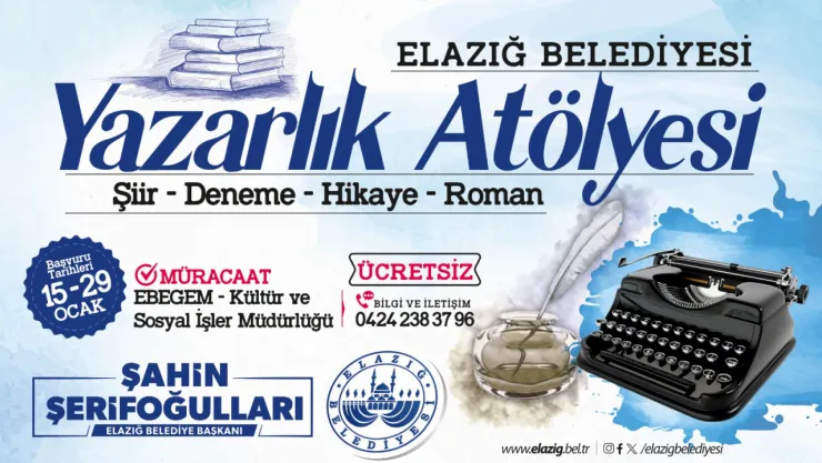 Sosyal projeleriyle toplumun her kesimine hitap etmeye devam eden Elazığ Belediyesi, vatandaşların kişisel gelişimlerine destek olmak ve edebiyat alanında yeteneklerini keşfetmelerini sağlamak amacıyla ücretsiz olarak '3. Yazarlık Atölyesi'ni başlatıyor. Düzenlenecek olan atölye, yazarlığa ilgi duyanlara kapılarını açacak.