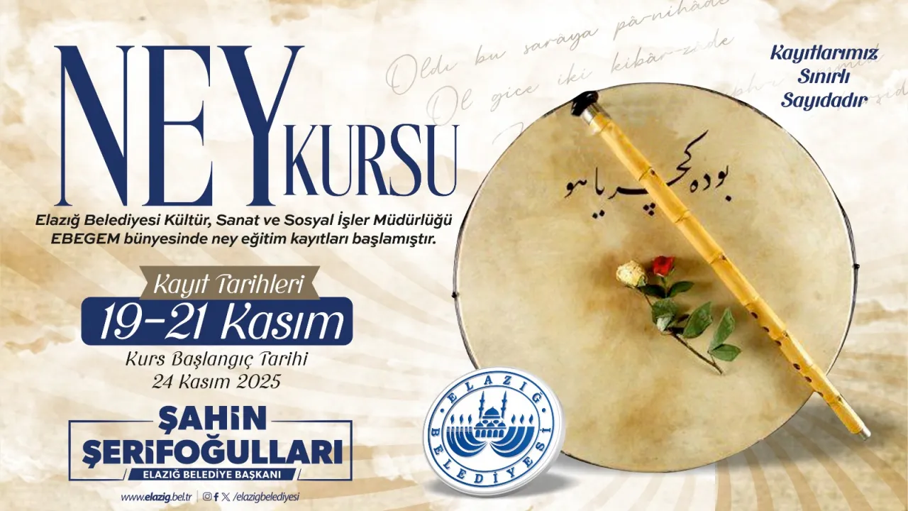Elazığ Belediyesi tarafından ücretsiz olarak düzenlenecek ney kursuna katılmak isteyen vatandaşlar, 21 Kasım Cuma gününe kadar başvuruda bulunabilecek.