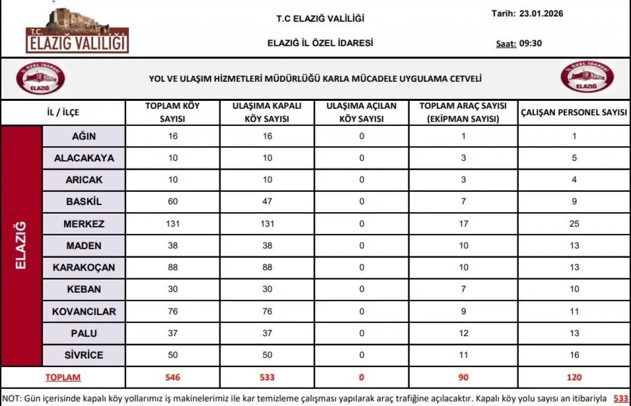Elazığ Valiliği İl Özel İdaresi Yol ve Ulaşım Hizmetleri Müdürlüğü tarafından yayımlanan 23 Ocak 2026 tarihli ve saat 09.30 itibarıyla hazırlanan karla mücadele uygulama cetveline göre, il genelinde çok sayıda köy yolu yoğun kar yağışı nedeniyle ulaşıma kapalı.