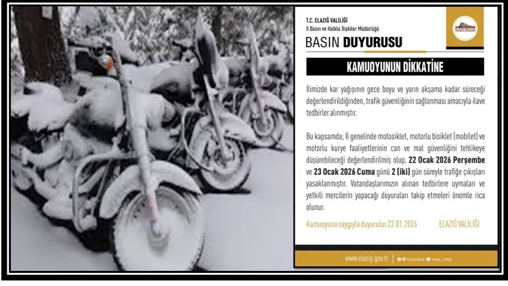 T.C. Elazığ Valiliği İl Basın ve Halkla İlişkiler Müdürlüğü’nün 19 Ocak 2026 tarihli basın duyurusuna göre; yoğun kar ve buzlanmanın özellikle iki tekerlekli araçlar için ciddi risk oluşturduğu değerlendirilirken, bu kapsamda motosiklet, motorlu bisiklet (mobilet) ve motorlu kurye faaliyetlerinin 2 gün süreyle trafiğe çıkması yasaklandı.