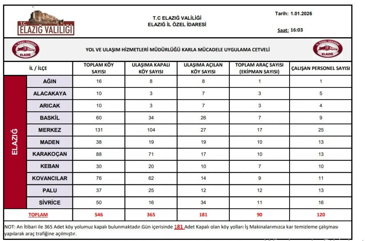 Elazığ Valiliği İl Özel İdaresi, 1 Ocak 2026 itibariyle il genelinde 365 köy yolunun kar nedeniyle ulaşıma kapalı olduğunu açıkladı.