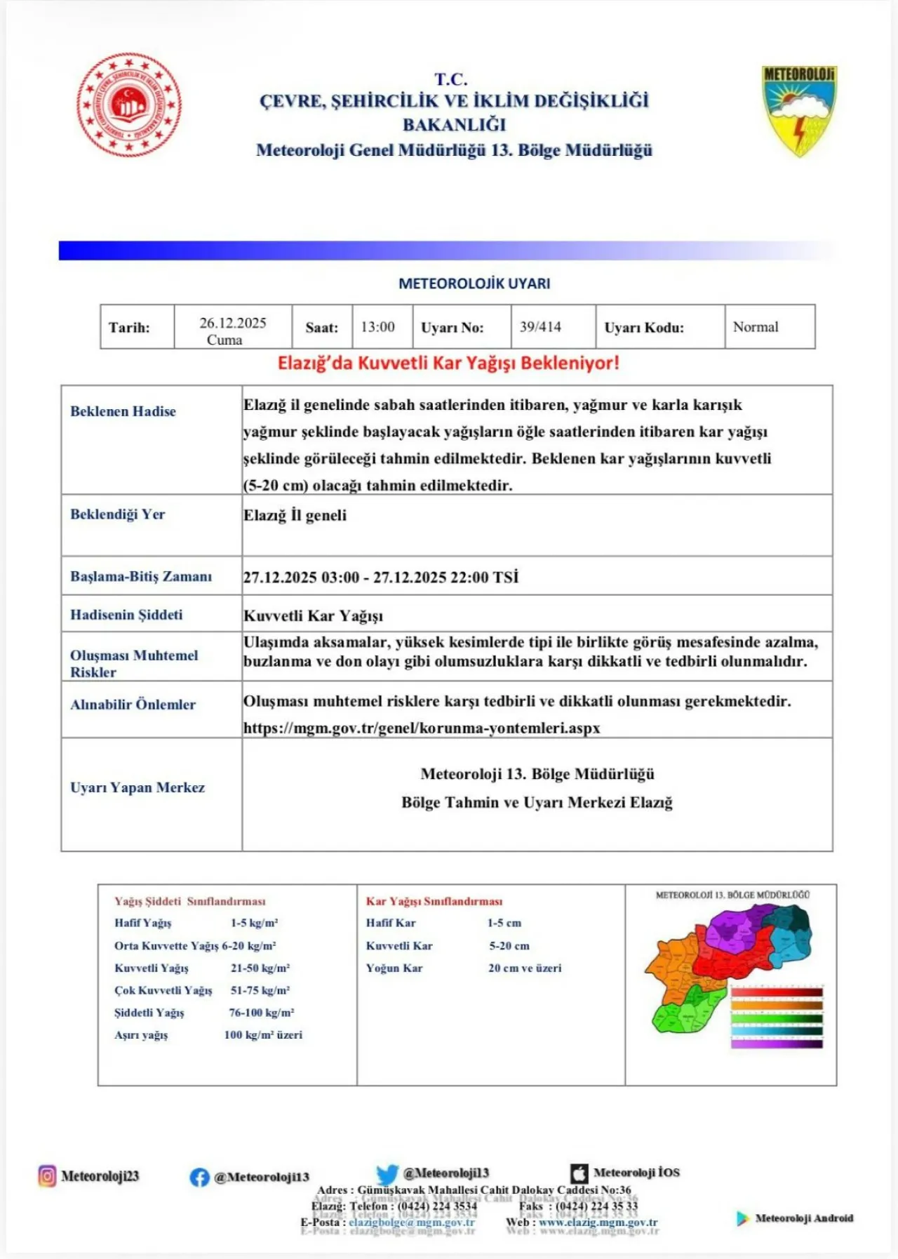 Elazığ Valiliği, 27 Aralık Cumartesi günü için meteorolojik uyarıda bulundu.