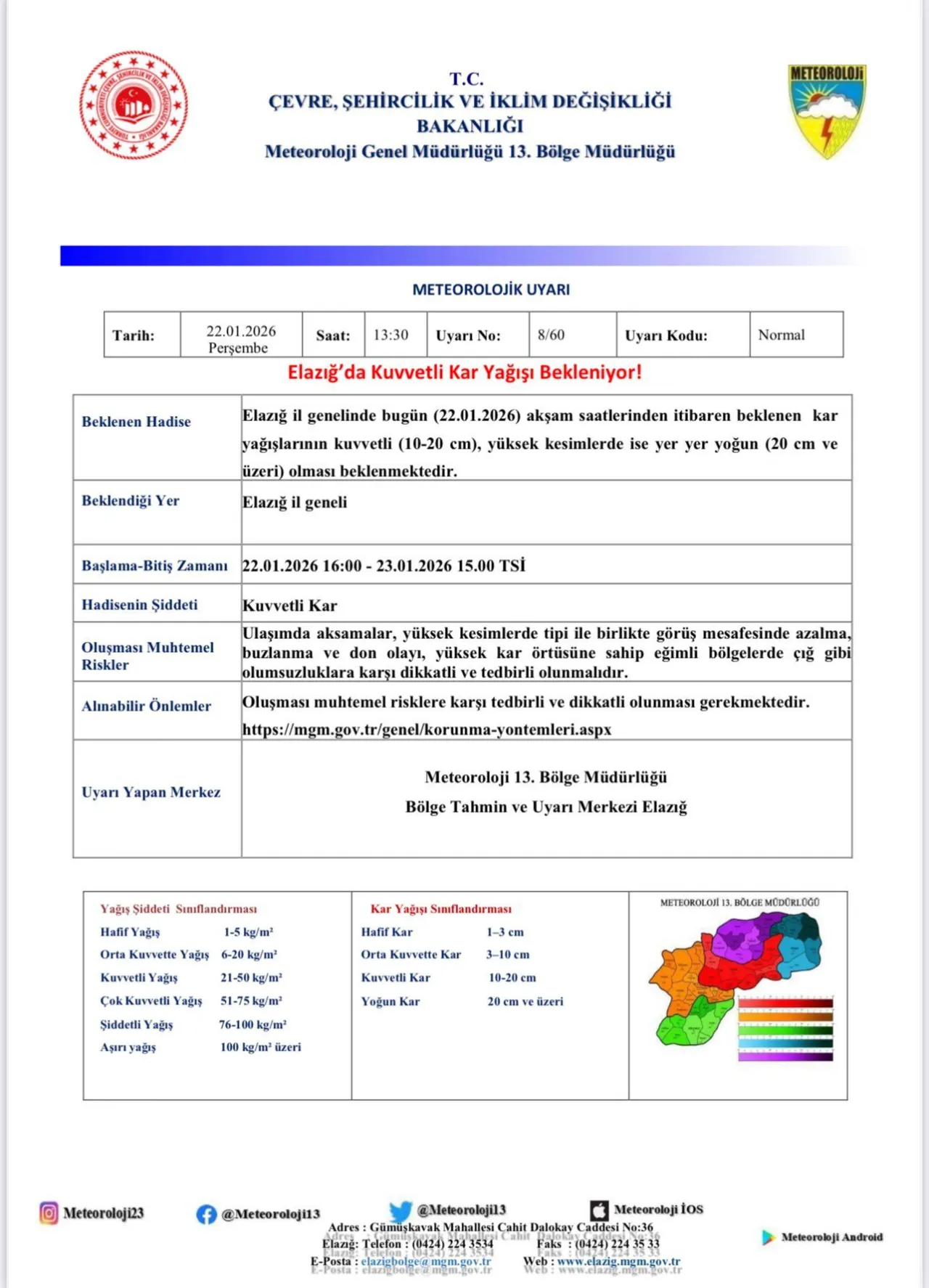 Elazığ Valiliği tarafından yapılan açıklamada, Elazığ genelinde 10–20 cm kar örtüsü, yüksek kesimlerde ise yer yer 20 cm ve üzeri yoğun kar yağışı beklendiği bildirildi. Kar yağışıyla birlikte ulaşımda aksamalar, buzlanma ve don olayları, yüksek kesimlerde tipi ile eğimli bölgelerde çığ tehlikesi gibi olumsuzlukların yaşanabileceği ifade edildi.