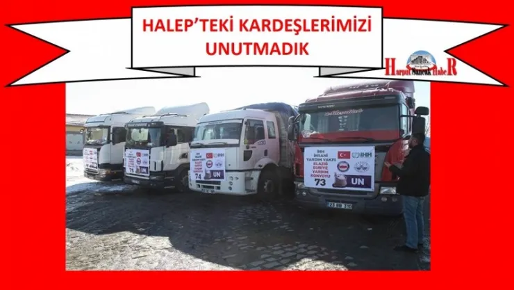 Geçmişten bugüne dünyadaki tüm mazlum halklara büyük bir kardeşlik ve merhamet örneği sergileyen Elazığlı hemşerilerimiz, 11 Ocak-31 Ocak 2017 tarihleri arasında başlatılan kampanya sonucunda topladıkları 4 tır yardım malzemesini, Suriye’nin kadim şehri Halep’e göndermek üzere dualar eşliğinde uğurladı.