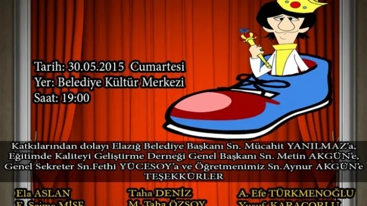 İsmetpaşa İlkokulu 2-H sınıfının düzenlediği 'Pabucumun Kralı' tiyatro gösterisi 30 Mayıs Cumartesi günü Elazığ Belediyesi Kültür Merkezi'nde izleyiciyle buluşuyor.