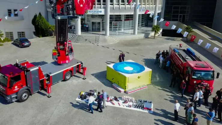 Büyükşehir Belediyesi yüksek yangınlara müdahale edebilmek için ihtiyaç duyulan 42 metre uzunluğa sahip merdivenli araç alımı gerçekleştirdi.Alınan yeni aracın tanıtımı için Büyükşehir Belediye Binası önünde bir tören düzenlendi.