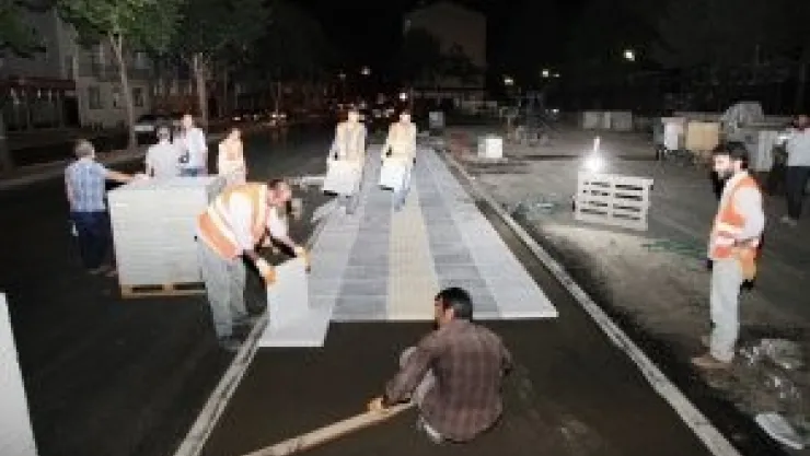 Şehrin estetik yapısına katkı sağlayan kaldırım çalışmaları, mevsim koşullarının uygun olması nedeniyle gece-gündüz ayrımı yapılmaksızın tüm hızıyla sürdürülüyor.
