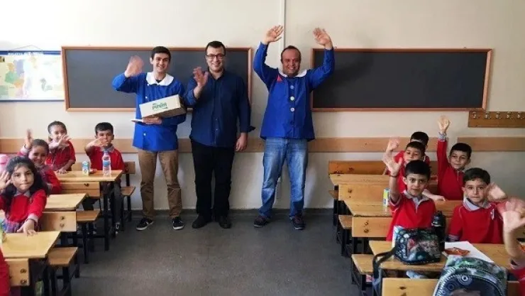 İlkokul birinci sınıflarını gezerek, öğrencilere oryantasyon süreciyle ilgili kısa skeçler oynayan Büyükşehir Belediyesi Şehir Tiyatrosu oyuncuları, etkinlik çerçevesinde öğrencilere ayrıca; meyve suyu ve kek de dağıtıyor.