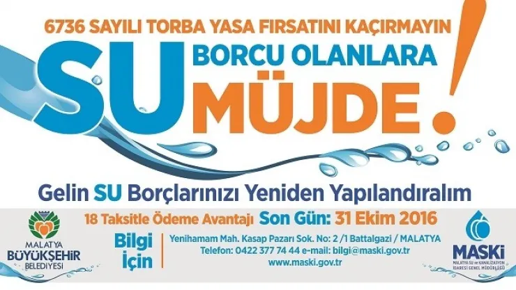 Vatandaşların mağdur olmamaları için mutlaka bu yasadan faydalanması gerektiğini belirten Malatya Büyükşehir Belediyesi MASKİ Genel Müdürü Dr. Özgür Özdemir, “Vatandaşlarımız, 30 Haziran 2016 tarihinden önceki borçları kapsayan yapılandırma fırsatı için 31 Ekim 2016 tarihine kadar MASKİ Genel Müdürlüğü Abone İşleri Dairesi Başkanlığı’na (Eski SOS Binası) başvuru yapabilirler. Yapılandırma kapsamında vatandaşlar borçlarını 6, 9, 12 ve 18 taksitte ödeyebilirken borçların peşin ödenmesi durumunda ise Yurt İçi Üretici Endeksi (Yİ-ÜFE)'de %50 indirim sağlanacak. Borçlarını yapılandıran vatandaşlar ödemelerini 2 ayda bir yapabilecek” dedi.