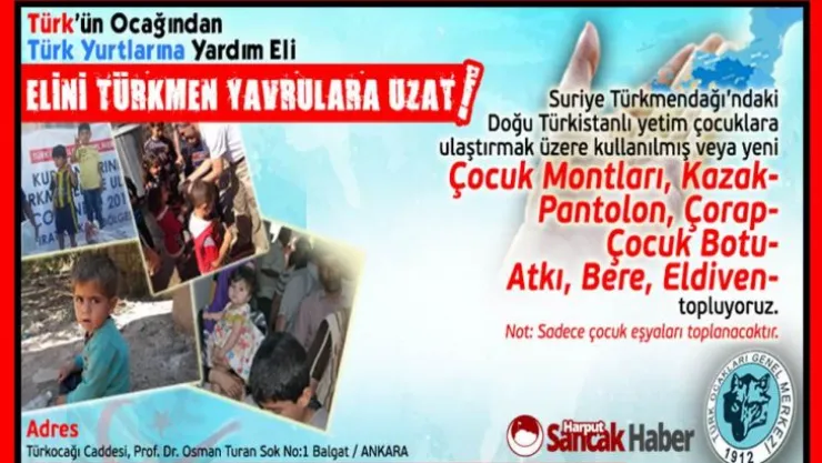 Türk Ocakları Genel Merkezi tarafından yürütülen "Türk'ün Ocağından Türk Yurtlarına Yardım Eli" kampanyası kapsamında Suriye Türkmendağı'nda yaşayan Doğu Türkistanlı yetim çocuklar için kışlık giyim yardımı toplanacaktır. Bu kampanya kardeş sivil toplum kuruluşu Kurt-Ar Uluslararası İnsani Yardım Derneği ile birlikte yürütülecektir.