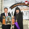 Büyükşehir Belediye Başkanı Selahattin Gürkan ziyaretin anısına Patrik Maşalyan’a Kral Tarhunza Heykelini hediye ederken, Patrik Maşalyan’da Başkan Gürkan’a ‘Osmanlı Saray Kuyumcuları’ isimli bir kitap hediye etti.