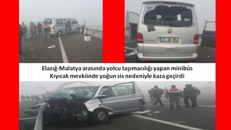 Elazığ-Malatya arasında yolcu taşımacılığı yapan minibüs sabah 7:30 sıraları Kale ilçesini geçtikten sonra yaklaşık Kıyıcak mevkinde yoğun sis nedeniyle kaza geçirdi.
